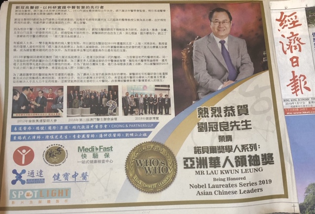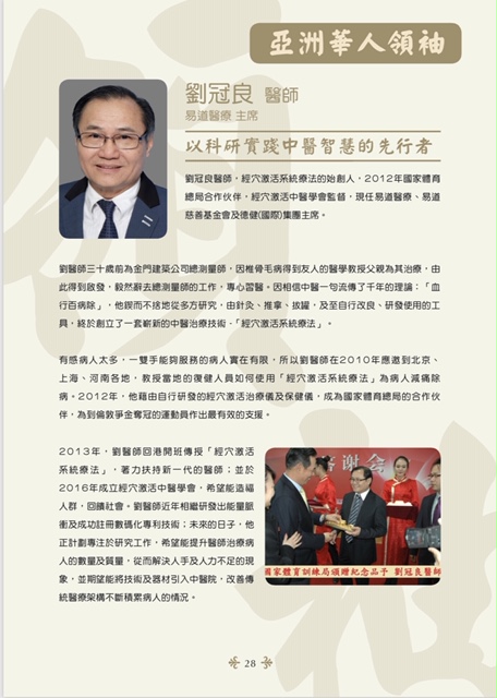 2019年,劉冠良醫師榮膺諾貝爾學人系列之亞洲華人領袖獎,被譽為「以科研實踐中醫智慧的先行者」;另外,並擴充易道醫療的規模,成立天激養生坊,將培訓對象拓展至準醫師及養生復健人員,為守護健康再踏前一步。